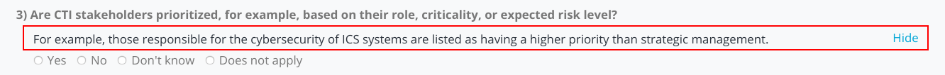 The CTI maturity assessment consists of roughly 250 questions and will take up to 1-2 hours of your time. The goal of these questions is to establish how well a practice is established and consistently performed, it is not necessary to overthink questions. The assessment will explore the following three topics: