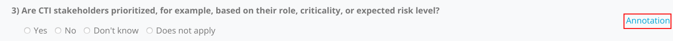 The questions relate to some activities or procedures, to give you examples of how this might be implemented we provide guidance for some questions. You can find these by expanding the “annotation”, as demonstrated in the image below. Annotations bring context to a question, intending to help you to determine the correct response, they are not a single truth and are there for guidance only.